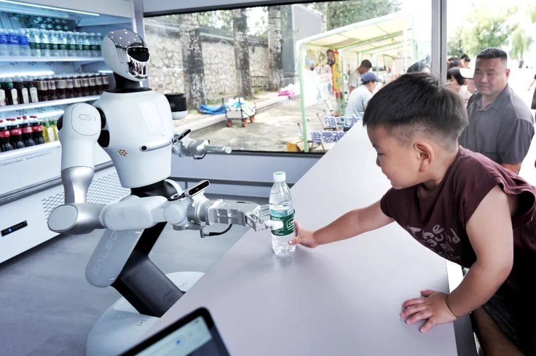 在北京颐和园的一家机器人零售店,机器人向小朋友交付商品。中新社记者 张祥毅 摄